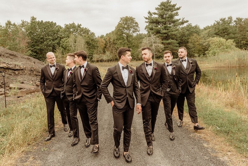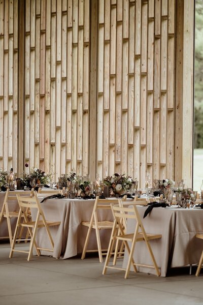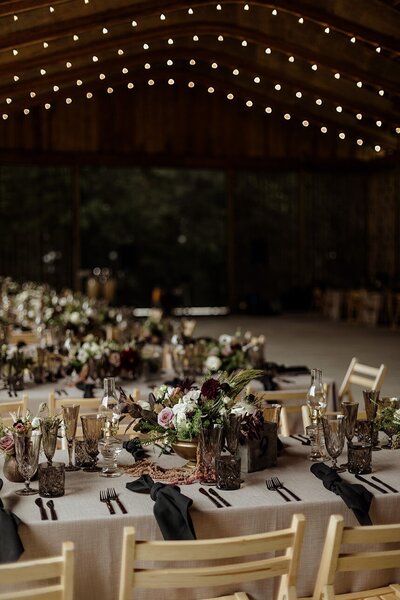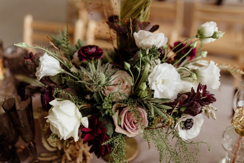 Set at Gather Greene during peak autumn, Brittany and Carmen’s wedding was grounded in moody textures, rich color, and thoughtful sculptural details. We worked with mauve and deep burgundy hues to play off the sharp black elements woven throughout the day. Panda anemones, white roses, and mixed metals brought balance and contrast while allowing the season to speak for itself. The ceremony featured a deconstructed arch that was later reimagined as a reception installation, positioned against the concrete wall and lit by candlelight. A custom velvet wall by Emu Studio showcased personal photos, artwork, and a hand-drawn crest, all surrounded by potted plants and lanterns. Every element was created without floral foam.